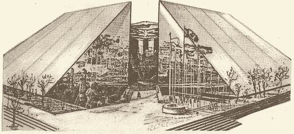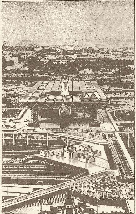 Японские павильоны в силу особого техницизма, утрированной индустриальности «почерка» архитектурного проектирования, смелого экспериментирования в области формы производили впечатление «нездешности», перемещения посетителя в неведомый город XXI в. Одним из подобных сооружений и в то же время наиболее интересным образцом «космической» архитектуры был павильон «Сумитомо». Его вертикальный каркас, напоминавший мостовую ферму, соединялся с элементами сферической формы, поднятыми над поверхностью земли и как бы парящими в воздухе.
