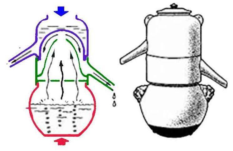Источником вдохновения для Солано послужил древний японский самогонный аппарат «Ранбики». Его прелесть была в том, что он был чисто керамическим и очень простым в изготовлении. «Ранбики» состоит из трёх частей. Нижняя — это всего лишь горшок с сырьём. Верхняя — это сосуд для проточной воды с сильно вогнутым дном, образующим купол над горшком с сырьём. А промежуточный сосуд служит для сбора спирта, стекающего по куполу.