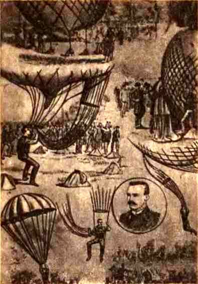 Летом 1889 года в Петербург приехал парашютист американец Чарльз Леру. Он уже тогда прославился своими прыжками и в Америке и в Европе. Его «представления», как тогда называли прыжки с парашютом, изумляли всех своей смелостью. Они происходили в увеселительном саду «Аркадия», на берегу реки Невки. Вот как описывалось в одной из столичных газет выступление Леру: «Посреди большой площадки сада возвышается желтый аэростат. На нем сбоку висит парашют, шнуры которого оканчиваются большим кольцом, зацепленным за борт корзины. Вот оркестр заиграл марш, и в, дверях ближайшего павильона показался человек, одетый в трико. Это знаменитый Чарльз Леру. Встреченный громкими рукоплесканиями, он быстро пробежал к аэростату и ловко вскочил в его корзину, где уже находился его помощник, который должен был управлять
