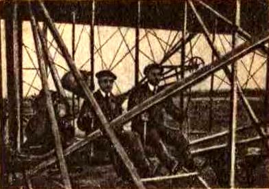 Братья Орвилл и Уильбур Райт на своем первом аэроплане. (С современно фотографии).