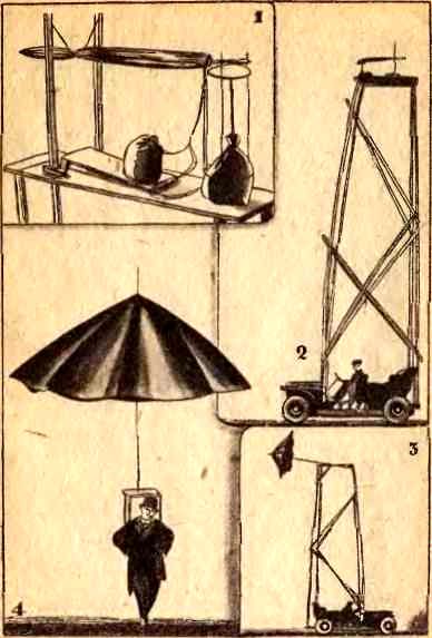 Авиационный парашют Вассера и его испытание. 1. Парашют, уложенный на вышке. 2. Вышка, укрепленная на автомобиле. 3. Парашют раскрылся. 4. Вассер со своим парашютом. (По современным фотоснимкам).
