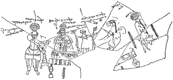 Рис. 20. Рисунок с большого сосуда (пифоса) из Ашшура: бог, богиня и ребенок на троне и ложе между двоими верующими, которые бросают благовония на курильницы – с арамейскими надписями. Высота изображения 30,5 см. Позднепарфянский период.