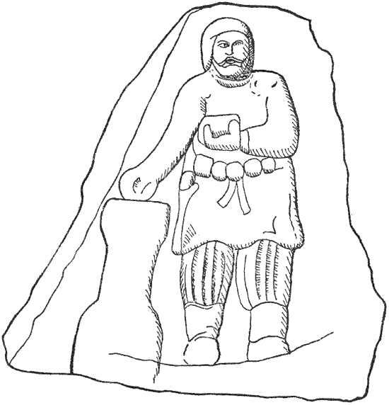 Рис. 21. Рельефное изображение парфянского вельможи, бросающего благовония из сосуда на курильницу. Изображение со скалы в Бехистане. Вероятно, II в. н. э.