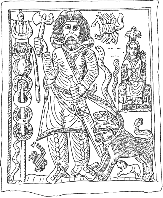 Рис. 46. Религиозный известняковый рельеф из Хатры. В центре божество держит секиру и поводок трехголового пса, стоящего справа. Справа от божества – штандарт Хатры, слева – какая-то богиня, возможно Атаргатис. На поле – символические змеи и скорпионы. Вероятно, II в. н. э.
