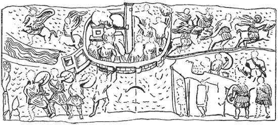 Рис. 47. Рельеф с триумфальной арки Септимия Севера в Риме, воздвигнутой в 203 г. Видимо, он иллюстрирует эпизод парфянской кампании Севера 198 г. В центре – осажденный город (Селевкия на Тигре?), из которого во все стороны разбегаются его защитники. Справа внизу – римские солдаты в кольчугах готовятся к атаке.