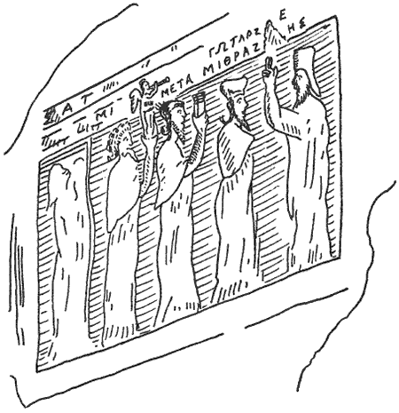 Рис. 4. Скальный рельеф, изображающий царя Митридата II перед четырьмя его вассалами. Бехистан, высечен между 123-м и ПО гг. до н. э. и сильно разрушен в XVIII в. Изображение в рост человека.