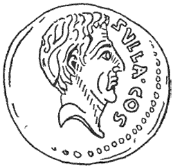 Рис. 5. Денарий с головой Суллы, отчеканенный Помпеем Руфом около 59 г. до н. э. Примерно 3:1.