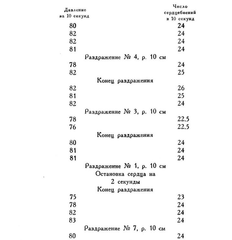 3 -й о п ы т. Обычное приготовление животного. На нитки взяты шесть номеров: № 1 (главная сердечная ветвь) останавливает сердце. Точно так же № 2 и 3. № 4 и 5 сильно ускоряют и понижают, № 6 останавливает, а после раздражения ускоряет. Раздражение, р. 7 см, повторено с тем же эффектом три раза. Давление 70 мм. Число сердцебиений в 10 секунд 20. Впрыскивается атропин (в протоколах не отмечено - сколько).