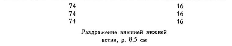 Обычная обстановка опыта. Раздражаются толстая внутренняя ветвь, нижняя внешняя ветвь и нижний отрезок вагуса. Испробованные несколько раз ветви действуют следующим образом: толстая внутренняя ветвь повышает давление, либо едва ускоряя ритм, либо вовсе без всякого его ускорения; нижняя внешняя ветвь вызывает ускорение, причем давление несколько падает, вагус же тормозит сердечную деятельность».