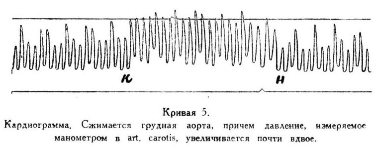 Второе предположение о происхождении разбираемого укорочения состоит в следующем: не есть ли это изменение побочный результат раздражения главной ветви? Она, как мы уже знаем, повышает кровяное давление. Не является ли укорочение следствием этого повышения? Но простые контрольное опыты устраняют совершенно такое толкование факта. Придавливание аорты изменяет рисунок сердечных сокращений скорее в обратную сторону, т. е. увеличивает линию сокращения, как видно из прилагаемой кривой (кривая 5).