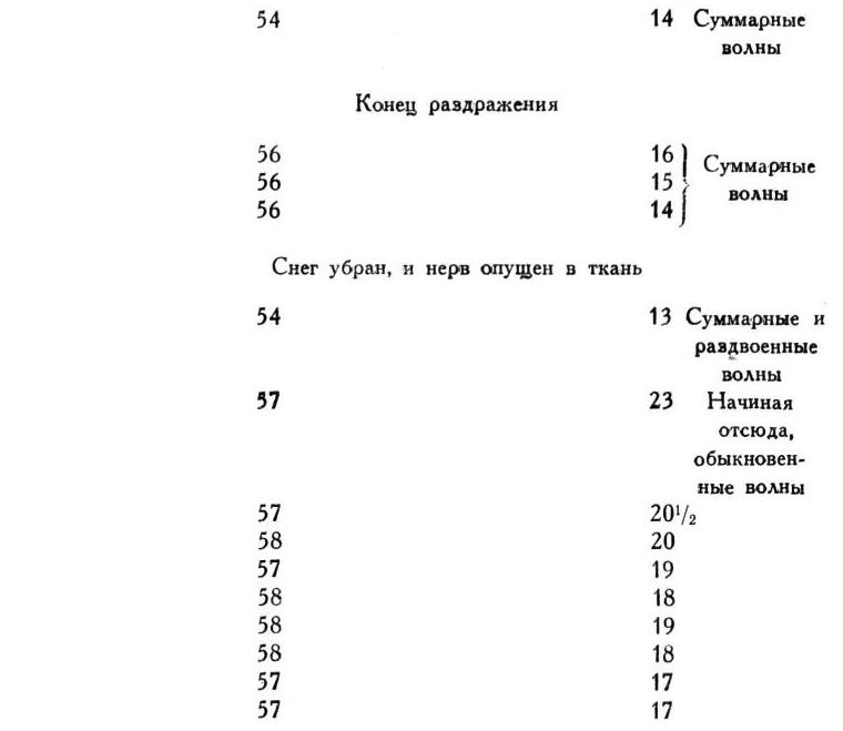Чтобы придать опыту еще большую убедительность, я заменил анатомическую перерезку главной ветви «физиологическою», т. е. временным уничтожением проводимости. Ради этого, как это уже было применено в моей другой работе, [114] я погружал известную часть нерва в снег или клал на лед. После того или другого промежутка времени снег убирался, нерв, опущенный в ткани, нагревался и снова приобретал проводимость.