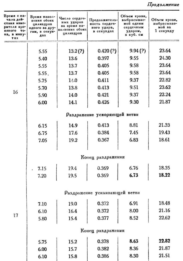 На основании этих данных простыми вычислениями определяются как объем крови, выбрасываемой одним сердечным сокращением, так и объем крови, выбрасываемой в одну секунду. Из кривых опыта путем измерения и счета составлены ниже приводимые таблицы.