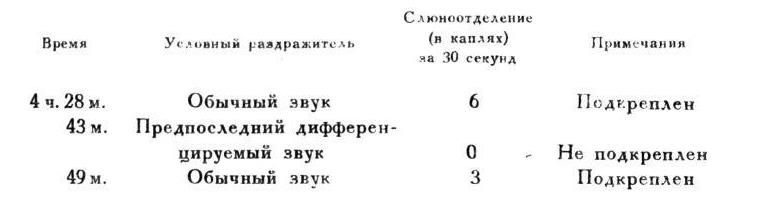 Тон (800 колебаний в секунду) - условный пищевой раздражитель, тона (812 колебаний в секунду) - основательно отдифференцированный агент. Оба посторонние раздражителя, бульканье и запах уксусного амила, испытанные отдельно, не сопровождались слюноотделением.