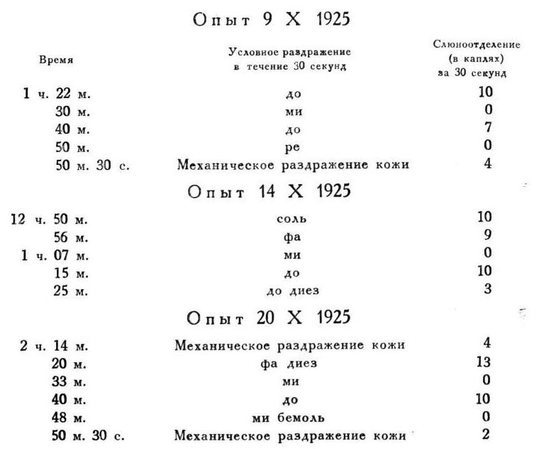 У одной собаки был выработан условный следовой кислотный рефлекс на тон органной трубы в 1740 колебаний в секунду, причем тон продолжался 15 секунд и по прекращении его, спустя 30 секунд, производилось вливание собаке в рот кислоты. Этот следовой рефлекс повторялся 994 раза в течение 1 года и 9 месяцев. Латентный период, считая от начала тона, составлял около 25 секунд, или, считая иначе, 10 секунд от начала следов тона. Когда одни опыты с этим рефлексом