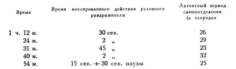 были покончены, было решено тот же тон переделать для других опытов из следового условного раздражителя в наличный условный, т. е. получать от него эффект не по прекращении, а еще во время его действия.Для этого тон на пятнадцатой секунде его продолжения сопровождался вливанием кислоты. После -вадцатикратного повторения такой процедуры не только не появилось условного рефлекса в течение 15 секунд, но после вливания кислоты слюноотделение начиналось лишь спустя 10 секунд, т. е. спустя те же 25 секунд от начала тона. Примененные вместо тона другие звуковые раздражители ничего не изменили в положении дела. Когда же тон и эти раздражители изолированно без вливания кислоты применялись 45 секунд, то спустя около 25 секунд от начала их слюноотделение начиналось и быстро достигало значительной величины (10 капель за остальные 20 секунд). После этого вливание кислоты начали производить спустя только 2 секунды от начала звучания тона. И, однако, после очень большого количества (многих десятков раз) таких сочетаний слюноотделение как во время вливания кислоты, так и при одном звучании тона без кислоты начиналось только около двадцатойдвадцать пятой секунды от начала тона.