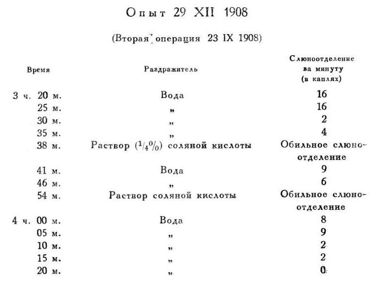 Безусловный слюнной рефлекс прямо после операции тоже совершенно исчезал, но затем скоро восстанавливался, сначала с некоторыми отступлениями от нормы, но потом с течением времени изгладившимися. Положительных слюнных рефлексов от раздражения с глаза, уха и кожи получить не удалось, несмотря на энергичные меры, при этом принимаемые. Так, только под звук бульканья собака долгое время получала всю ежедневную пищу. Тем не менее при пятисоткратном применении этого приема бесспорного условного слюнного рефлекса не получилось. Тогда мы испытали раздражения с рецепторной поверхности, о которой уже раньше было сообщено, что она при различных нарушениях больших полушарий оказывается устойчивее всех других поверхностей, именно с ротовой поверхности, в виде водяного условного рефлекса. Эти опыты я и передам теперь в подробностях. Из раннего сообщения мы знаем, что значительный слюнной рефлекс на воду, введенияю в рот, получается только после предварительного введения в рот отвергаемых веществ в виде водяных растворов, например кислоты, так как вода сама по себе или совсем не вызывает слюноотделения, или только минимальное. При многократном введении кислоты нашей собаке вода впервые обнаружила значительное слюногонное действие около месяца спустя после операции. 50 дней спустя после операции были начаты систематические опыты с водяным рефлексом. Когда кислота вливалась часто, изо дня в день, то в день опыта вода, примененная в опыте как первый раздражитель, т. е. без предварительного введения кислоты, вызывала обильное слюноотделение, до и более капель за минуту. Это слюноотделение исчезало, если повторно вливалась одна вода.