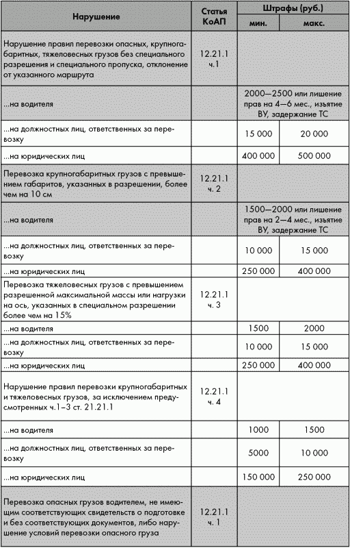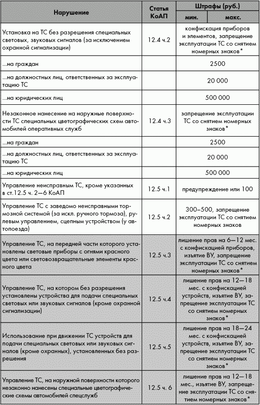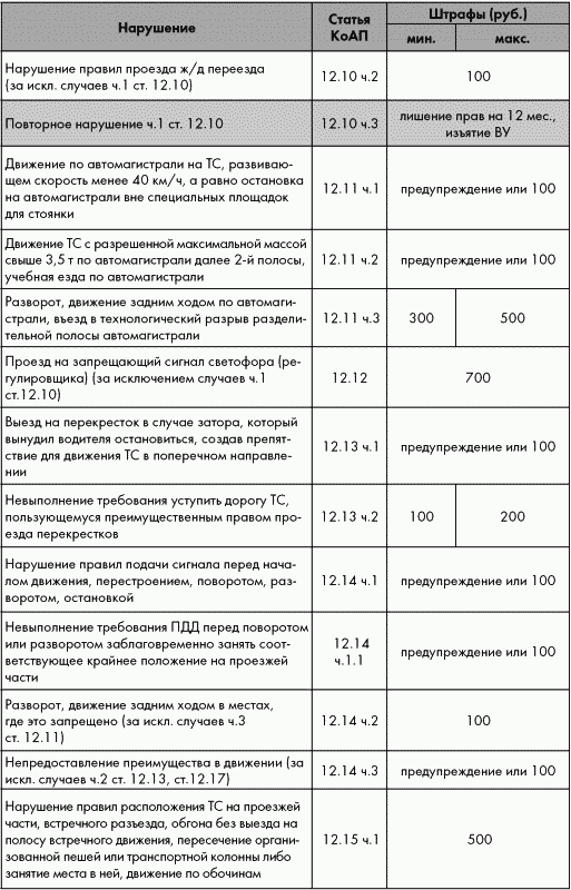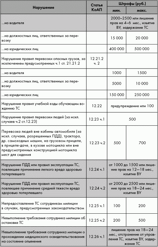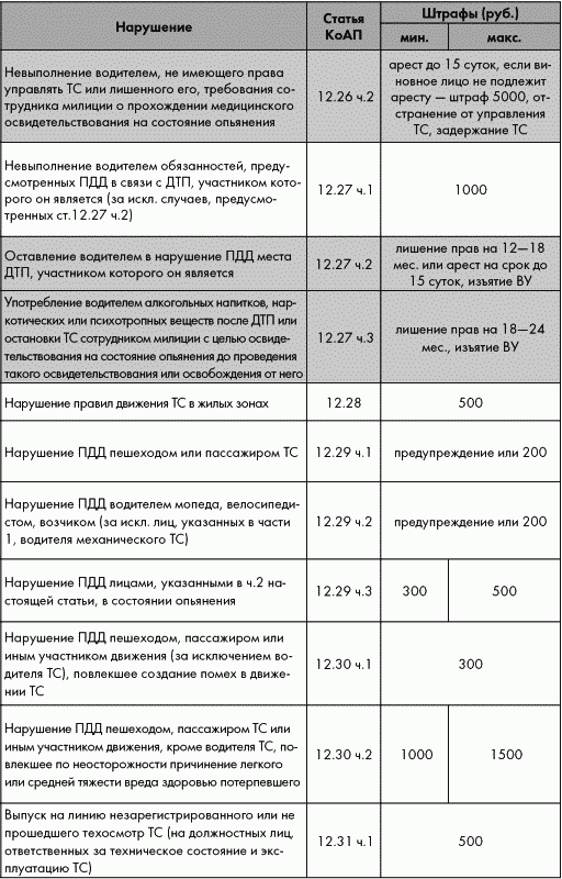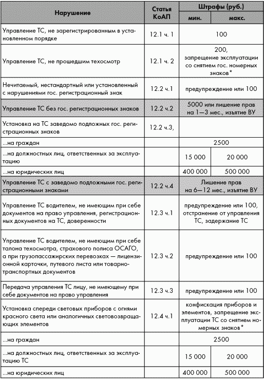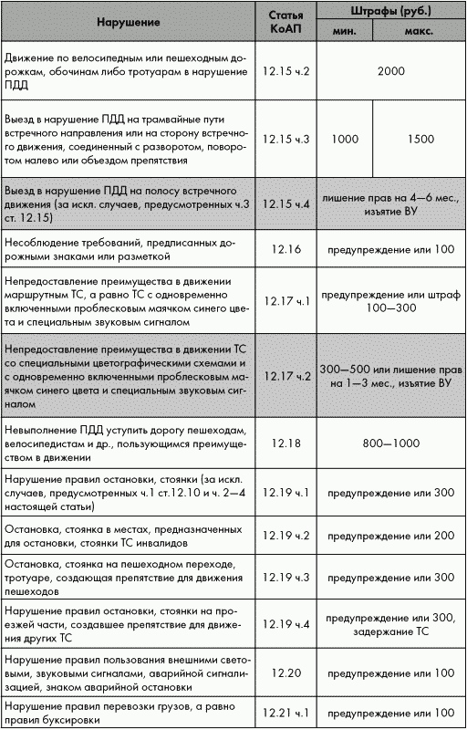 Фоном выделены нарушения, за которые возможны лишение водительских прав или административный арест.