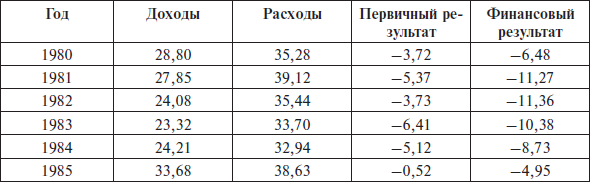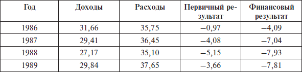 Критика официального курса во многом была справедливой. Правительство не сумело выправить ситуацию и решить кардинальные проблемы национального развития. Пример тому – сохранение хронического бюджетного дефицита, унаследованного от прошлых времен и подрывавшего финансовую стабильность государства. Ни «План Аустраль», ни «План Весна» не привели к ликвидации дефицитности государственной бюджетной системы. Более того, в 1987–1988 гг. первичный дефицит достиг угрожающих размеров порядка 4–5 % ВВП (см. табл. 3.4).Таблица 3.4 Основные параметры государственного бюджета (в % от ВВП)