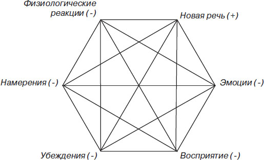 Гексагон способен поддерживать себя как систему, потому что все его вершины взаимодействуют друг с другом. Такое взаимодействие происходит постоянно в режиме реального времени. Например, не только убеждения имеют отношение к нашему восприятию. На восприятие влияют и эмоции, и поведение, скрытые убеждения и даже чувствительность, заложенная в нас генетически. Любое изменение на одной из вершин Гексагона откликается в других его точках. Этот принцип справедлив по отношению к любой точке Гексагона.
