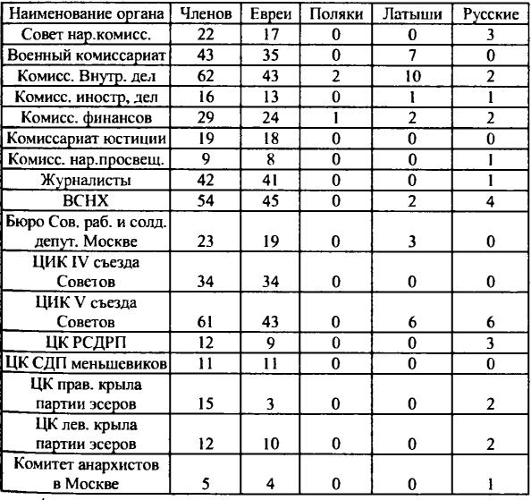 — Военный комиссариат (народный комиссар армии и флота Л. Троцкий): из 43 членов евреев — 35, латышей — 7 немцев — 1, русских — 0.