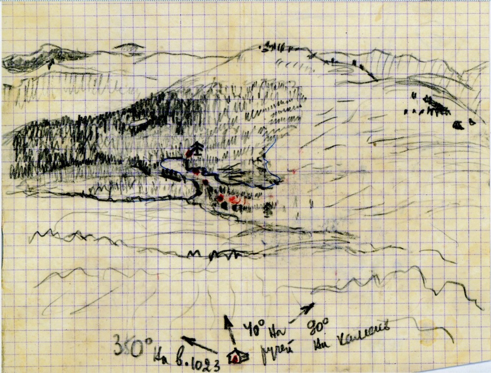 Вид от палатки на район поисков (долина Лозьвы). В центре – кедр (стрелка от палатки 400).