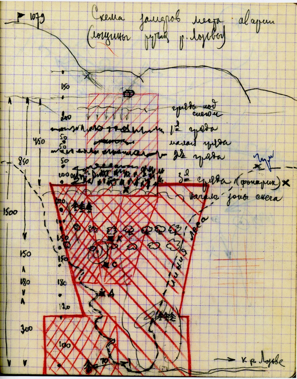 На следующий день зонды были у нас. Небольшой инструктаж, обучение, как ими пользоваться, и стройная шеренга поисковиков выстроилась, прощупывая толщу снега через каждые полметра. По команде каждый делал укол слева от себя, впереди и справа. Затем вся шеренга делала шаг вперёд и всё повторялось. Нудная и скучная работа. Чтоб не зондировать всю долину Лозьвы, Е.П. Масленников составил схемы, показав, где сосредоточить поиски. Где, по его мнению, можно под снегом найти тела пятерых не обнаруженных погибших туристов.