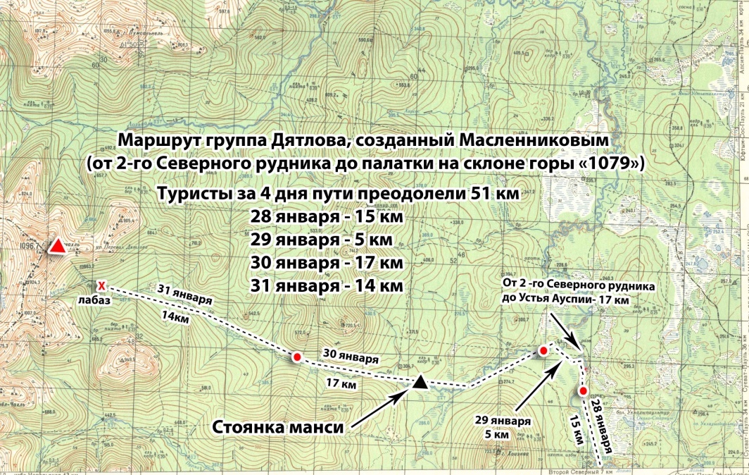Получается интересная история. Исходя, из записи в тетради, туристы за 29 и 30 января, прошли вверх по Ауспии, 30 км. А на допросе за эти же дни всего 22 км, из которых 2 км по Лозьве. То есть на 10 км меньше. Что выглядит очень странно. Но ещё удивительней расстояние пройденное туристами за 28 января, вообще 31 км. Интересно, откуда появилась такая странная информация, которая всё ставит с ног на голову. Ведь известно, что от 2-го Северного рудника до Ауспии, 17 км.