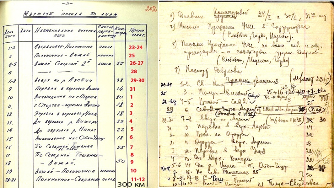 "Из дневниковых записей, кроков маршрута и проявленных фотопленок туристов усматривается, что 28.I.59 г. группа шла вверх по течению р. Лозьвы, 30. I. 59 г. группа продолжала движение, 31. I. 59 г. туристы вышли к реке Ауспии и пытались перевалом пройти к долине р. Лозьвы, однако из-за низкой температуры и сильного ветра они вынуждены были вернуться вниз и остановились на ночлег. I.II.59 г. в верховьях р. Ауспии туристы соорудили лобаз, в котором оставили запас продуктов и все излишнее снаряжение.