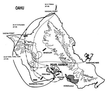 началу вылета самолетов. Точно в 1:30 (6:00) 8 декабря 1941 года в 230 милях от Оаху операция началась. Ответственный за воздушные операции офицер Хикочо дал разрешение на страт. Пилоты прибавили газу. Один за другим самолеты набирали скорость и поднимались в воздух. Взлет самолетов был точно синхронизирован с фазами продольного крена на волнах. Взлетевшие машины направлялись в пункты сбора. Первыми поднялись истребители А6М2 подполковника Сигеру Итая. В ходе взлета два истребителя получили повреждения. Один самолет с «Сёкаку» пришлось задержать на старте, а второй с «Каги» обнаружил проблемы с мотором уже после взлета. Этот «Зеро» не вернулся, поэтому был посчитан как пропавший без вести. Взлет первого эшелона завершили к 1:45 (6:15). Спустя пять минут полковник Мицуо Фучида приказал взять курс на Оаху.Одновременно с первым эшелоном взлетели истребители прикрытия эскадры. В 1:30 (6:00) с палубы «Дзуйкаку» взлетели истребители 1-го и 2-го звена 1-й эскадрильи (6 самолетов), которые вел капитан Юзо Цукомото. Одновременно с палубы «Хирю» поднялось 1-е звено энсина Харады, насчитывавшее 3 самолета. Спустя пять минут с палубы «Сёкаку» поднялись 1-е и 2-е звенья 1-й эскадрильи, ведомые капитаном Macao Изуки. В 1:35 (6.05) самолеты прикрытия эскадры сформировали боевой строй. Общее командование прикрытием принял на себя капитан Юзо Цукамото. Задача прикрытия сводилась к перехвату возможных самолетов противника. Машины должны были патрулировать район местонахождения эскадры в течение 4 часов. Самолеты с «Сёкаку» действовали на высоте 2000–2500 метров, а самолеты с «Дзуйкаку» — на высоте 4000–4500 метров.