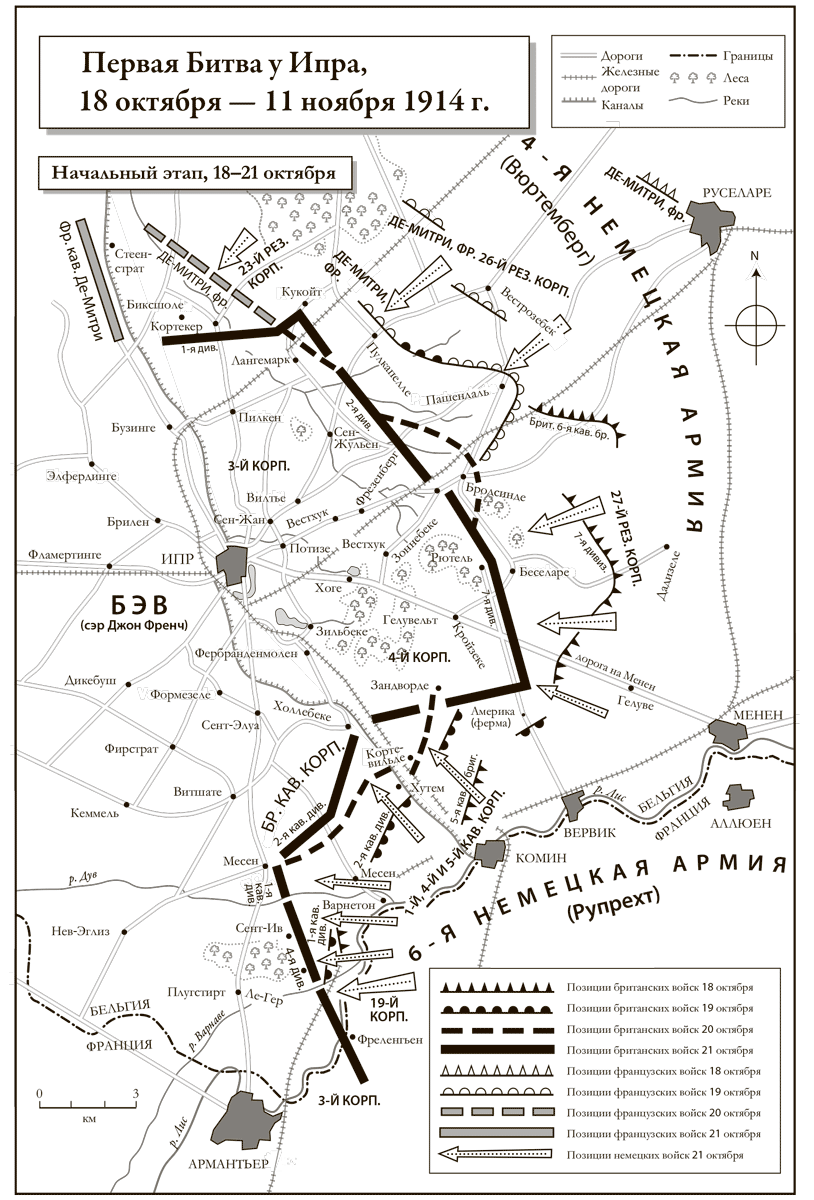 Несмотря на то, что средоточием немецких атак стал Ипр и 1-й корпус сэра Дугласа Хейга, на долю французских и британских войск дальше к югу на подступах к Армантьеру и позади Ла-Бассе хватало в последние две недели октября собственных отчаянных сражений. Штаб верховного командования, не осознавая размах немецкой операции, по-прежнему слал батальоны на линию фронта с приказами, позволяющими предположить, что вскоре инициатива наступления будет принадлежать союзникам. Действительность оказывалась иной. «Куда ни сунься, повсюду впереди немцы», – писал гренадер Джордж Джеффрис {984} . Уилфрид Абель-Смит горячился 22 октября: «Это все враки, будто впереди никого нет. Там тучи немцев, и вояки они отменные, и артиллеристы у них не мажут. <…> Мы, конечно, убиваем их толпами, а они все лезут и лезут…» {985}