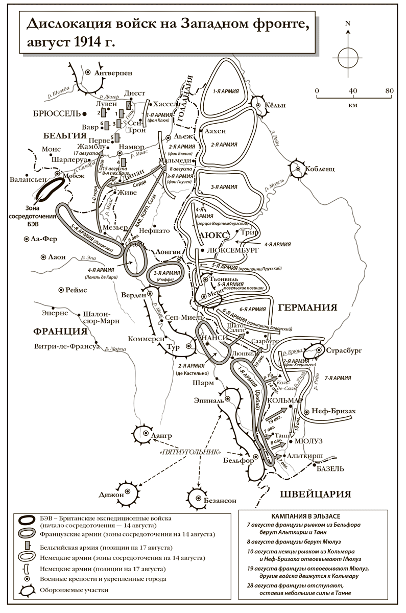 поэтому европейцы увлеченно рисовали мысленные картины появления царской орды на западных полях сражений.Диспозиции определились задолго до начала боевых действий. Германия отправила семь армий на Западный фронт, воплощая подкорректированный Мольтке вариант шлиффеновской стратегии – окружение французской армии с целью ее стремительного разгрома. Австрия почти половину своих войск ввела в Сербию, остальные остались в Галиции, где российская Польша граничила с империей Габсбургов. Сербы готовились защищать западные рубежи от австрийцев. Россия откомандировала две армии для вторжения в Восточную Пруссию и еще четыре – сражаться с Австрией. Франция действовала согласно «Плану XVII»; до 6 августа французским войскам было запрещено нарушать бельгийские границы (а аэропланам – пролетать через воздушное пространство Бельгии), чтобы ответственность за нарушение бельгийского нейтралитета полностью легла на Германию.