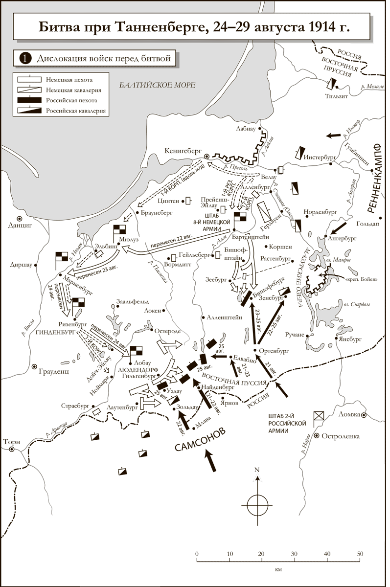 26 августа правый фланг Самсонова, возобновив наступление, угодил под разрушительный артиллерийский и стрелковый огонь двух немецких корпусов. Однако вечером ужин в штабной столовой Гинденбурга прошел в гробовом молчании. Поступило тревожное сообщение: армия Ренненкампфа идет на подмогу Самсонову, грозя переломить ход битвы, навалившись на немецкий фланг или тыл. Людендорф в ярости катал хлебный мякиш по столу. Потом вдруг потребовал личного совещания с Гинденбургом. Старый генерал тем вечером принес немалую пользу, усмирив бурю в душе подчиненного. Наконец пришли вести, опровергающие сообщение о подходе Ренненкампфа, – 1-я армия не двигалась с места. Потрепанные войска Самсонова оставались сражаться в одиночку.