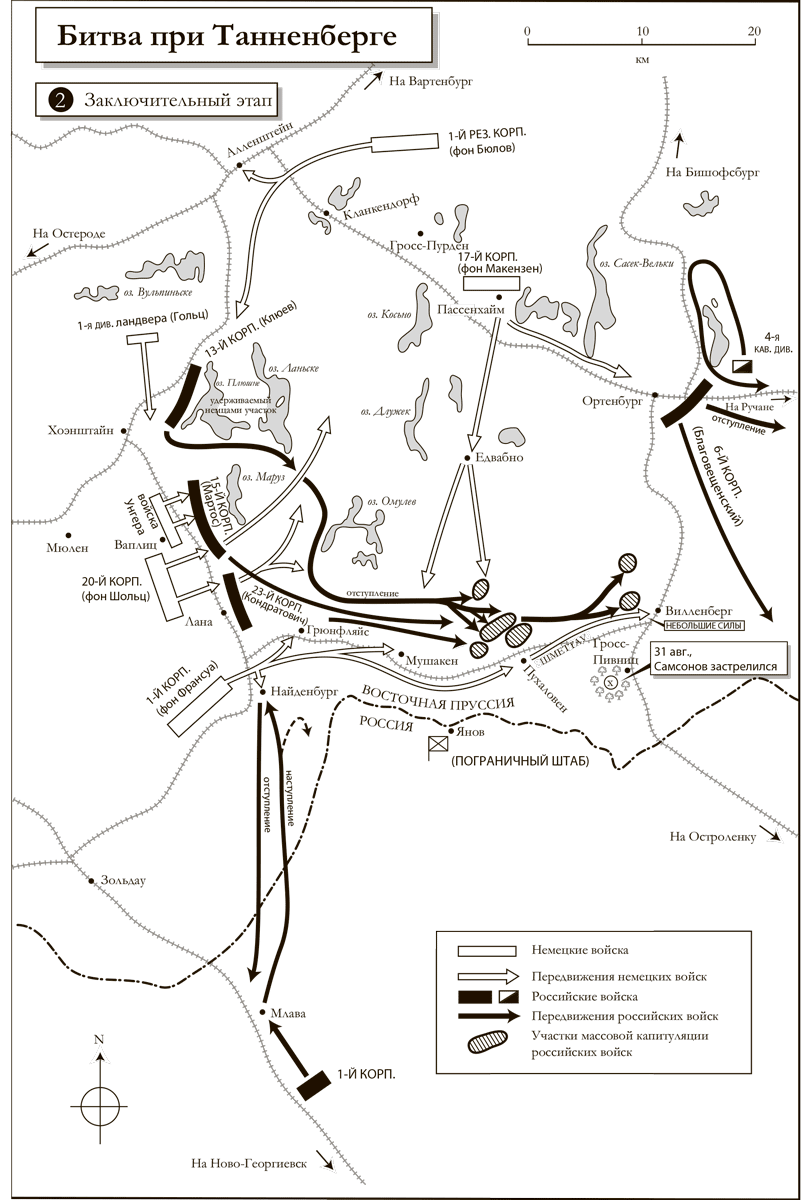 в Остроленке сбросили бомбы с дирижабля. К Самсонову постепенно приходило страшное осознание надвигающейся катастрофы. Однако в штабе 8-й армии пока отказывались верить в такую огромную удачу: в пятницу, 28 августа, настроение Людендорфа и его подчиненных омрачили донесения, что ряд атак захлебнулся, встретив отчаянный отпор русских, и несколько немецких частей даже сдались. Лишь в 4 часа дня пришли вести о том, что корпус Франсуа прорывается через тыл русских, сея ужас и провоцируя массовую капитуляцию. Только тогда немецкие генералы позволили себе возликовать, уверившись, что до большой победы рукой подать.Начальник самсоновского штаба Постовский отправил в тыл британского военного атташе Альфреда Нокса, заявив: «Положение серьезное, и иностранцу не след видеть наше плачевное состояние» {580} . Самсонов признался Ноксу, что армия отступает в беспорядке, добавив загадочно, что будущее ему неведомо, «однако даже если случится худшее, на конечном исходе войны оно не скажется» {581} . Вскоре после этого немцы нанесли последний сокрушительный удар по центру русских. Остатки 2-й армии начали хаотично отступать к польской границе. Свыше половины из 230 000 самсоновцев были убиты, ранены или взяты в плен; три атаковавших корпуса разбиты. Трупами были усеяны многие километры цветущих полей дикого люпина.