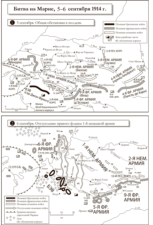 В начале сентября снова обернулись роковыми последствиями неудачи разведки – на этот раз немецкой. Армия Клюка двигалась на юг, оставляя Париж в 50 км к западу. Его аэроплан докладывал, что противник большими колоннами отступает к югу. На запад немцы не смотрели – точнее, смотрели краем глаза. Командующие не принимали во внимание доклады летчиков о сосредоточении французских войск у Парижа и за спиной клюковского фланга. Это формировалась 150-тысячная армия Манури. Вызванный из отставки в 1914 году 66-летний генерал артиллерии Манури получил под командование семь резервных дивизий. Немецкие командиры, уверенные, что французы (и малозначимые британцы) уже разбиты, пребывали в неведении, препираясь между собой, как лучше закрепить победу. Клюк продолжал преследовать британцев и 5-ю армию, которые по-прежнему никак не получалось догнать.