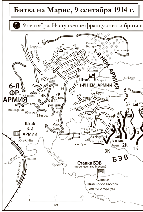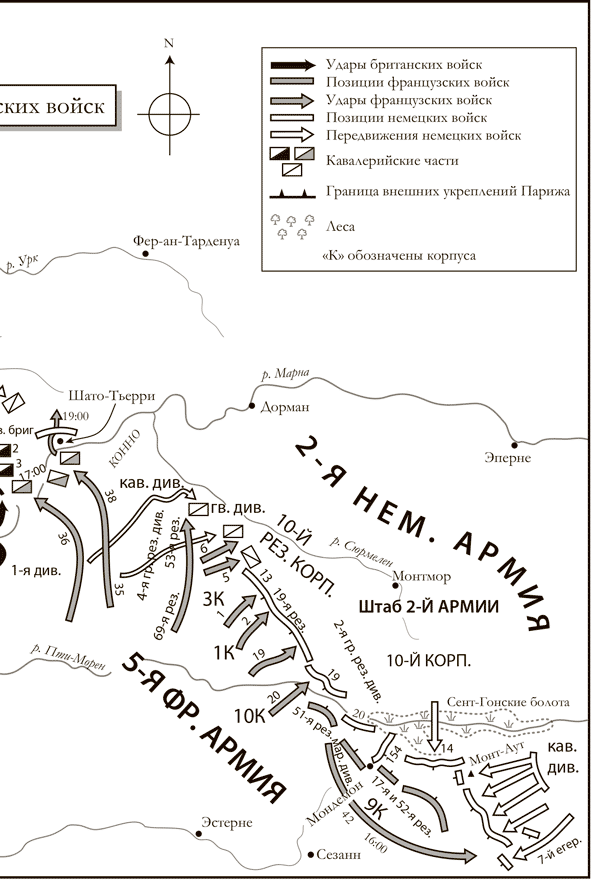 одобрено решение отступать, состоялась без Клюка, находившегося в каких-нибудь 300 м, на своем командном посту. Очевидно, что ни паника, ни отчаяние участниками этой беседы не владели. Они (в отличие от Мольтке) по-прежнему считали свое стратегическое положение чрезвычайно благоприятным. Перспектива большого охвата на севере развеялась словно дым, однако осталась надежда на решительный прорыв южнее, у Вердена. 9 сентября в Люксембурге кайзер сперва принял в штыки решение Мольтке (точнее, одобренное им решение Хентша) отвести правый фланг немецких войск к Эне. «Нет, нет и нет! И речи быть не может!» – заявил «Верховный». Однако после бурной дискуссии Мольтке отправился диктовать официальный план отступления. Жене он писал смиренно: «Независимо от исхода я должен нести ответственность и разделить судьбу своей страны».Между тем даже после того, как немцы начали отступать, на фронте Фоша продолжались ожесточенные бои на высотах, где немцы удерживали Шато-де-Мондеман, отражая одну атаку за другой. Подходы к шато были завалены погибшими французами. Но утром 10 сентября одна из дивизий Фоша ринулась в атаку на Фер-Шампенуа через Сент-Гонские болота и сопротивления не встретила. Немцы исчезли. Мондеман был отвоеван после того, как артиллеристы прикатили два орудия, пробившие бреши в стене, окружающей парк, с расстояния 300 м. Хлынув через обвалившуюся кладку, атакующие с изумлением обнаружили в городе лишь трупы противника – и отсюда немцы ушли.