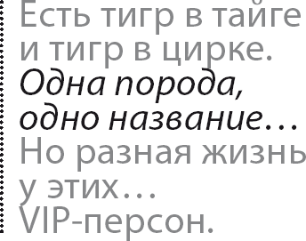 – Так вот… Есть тигр в тайге и тигр в цирке… И тот и другой – могучие, красивые, хищные. Каждому непросто его мясо достается. Одна порода, одно название, одинаковы с виду. Но разная жизнь у этих… VIP-персон.