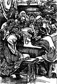 Вошел Маркешка, стряхнул рукавицами снег с валенок, снял шапку, перекрестился, поздоровался со всеми и сел на лавку возле статной, белой и румяной жены своей. Он старался казаться поважней, построже за большим столом, среди рослых казаков и казачек.