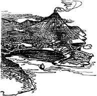 На рассвете ледяные купола вулканов поднялись еще выше и ярко сияли на солнце. Они казались белыми палатками, которые поставлены в небе. В трубу видно было, как громадные волны подбегали к черным подножиям скал и, ударяясь, подымали целые облака пены.