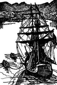 Налетел шквал. Вода вокруг закипела. Хлынул ливень. Зарифленные, тяжелые, намокшие паруса гулко заполоскали. Послышался свист и вой ветра и отчаянная брань боцмана.