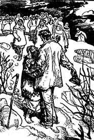 Грот и Бахрушев с тремя алеутами пошли в сопровождении всей толпы к деревне. Алеуты в шляпах с загнутыми полями тоже переобнимались со всеми и пытались разговаривать. Сахалинцы стали заглядывать алеутам в глаза.