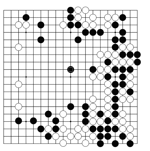 Но следующий ход Сюсаку изменил ход партии. Вы сами можете увидеть этот камень: чуть выше центра доски, отмеченный квадратиком.