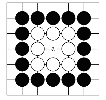 Ход белых на а — это самоубийство. Ход белых на b — тоже самоубийство. Поставить камень на а и на b одновременно белые не могут, и поэтому черные в безопасности — даже несмотря на то, что их группа окружена со всех сторон.