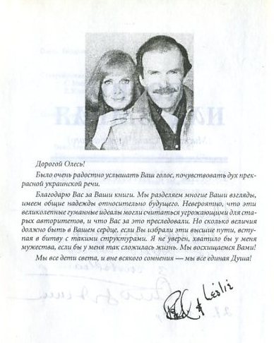 Благодарю Вас за Ваши книги. Мы разделяем многие Ваши взгляды, имеем общие надежды относительно будущего. Невероятно, что эти великолепные гуманные идеалы могли считаться угрожающими для старых авторитетов, и что Вас за это преследовали. Но сколько величия должно быть в Вашем сердце, если Вы избрали эти высшие пути, вступая в битву с такими структурами. Я не уверен, хватило бы у меня мужества, если бы у меня так сложилась жизнь. Мы восхищаемся Вами!
