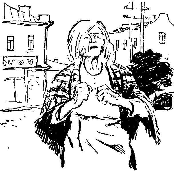 Навстречу попадается пожилая женщина с растрепанными седыми волосами, на плечах — рваная шаль.