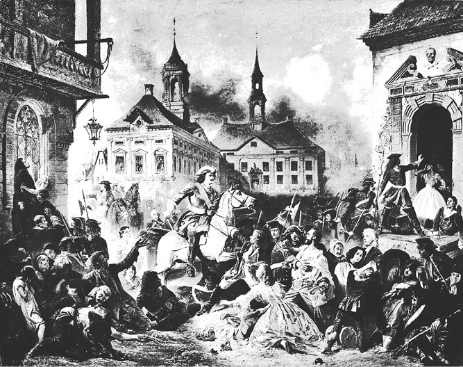 ПЕТР I УСМИРЯЕТ ОЖЕСТОЧЕННЫХ СОЛДАТ СВОИХ ПРИ ВЗЯТИИ НАРВЫ В 1704 г.