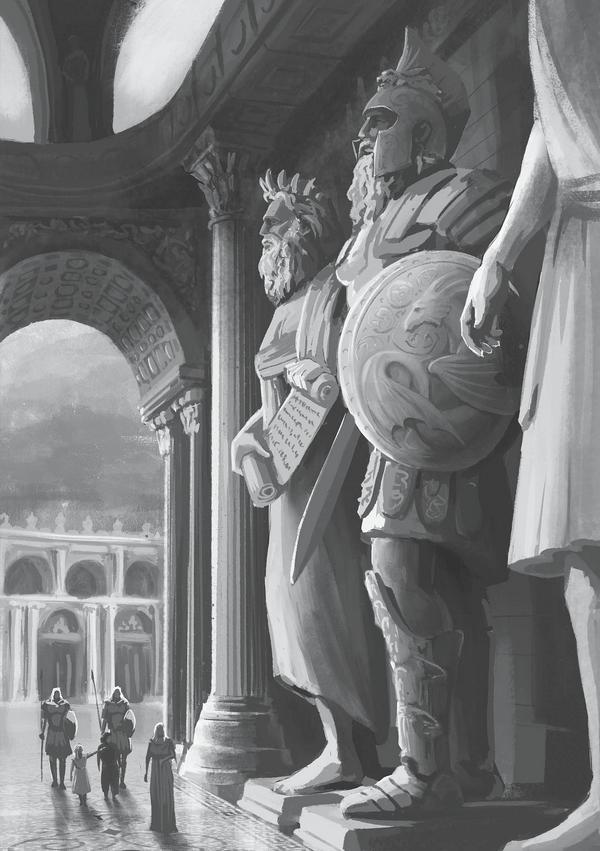 Зайдя туда, процессия оказалась в широком коридоре. Теперь вместо колонн по бокам возвышались огромные статуи древних воинов, коих было ровно десять, по пять с каждой стороны. Майкл обратил внимание, что, несмотря на отличия в вооружении и доспехах, все они были с одинаковыми лицами, будто бы скульптор размножил образ одного человека, снабдив его различиями в одежде.
