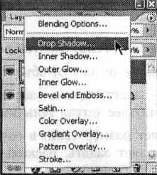 Теперь применим к рамке эффект тени. Для этого выделите слой с рамкой, если вы выбирали другие слои после выполнения предыдущих действий. Для получения доступа к слоевым эффектам можно использовать команду Blending Options (Параметры наложения) из контекстного меню пункта, соответствующего слою на панели Layers (Слои). Мы используем команду Drop Shadow (Тень) из меню, выводимого при щелчке на специальной кнопке, расположенной в нижней части панели Layers (Слои) (рис. 11.13).