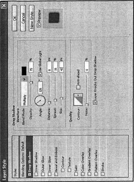 При вызове команды Drop Shadow (Тень) на экране появится окно, показанное на рис. 11.14. В его левой части расположены флажки, позволяющие включать и выключать отображение различных слоевых эффектов. При щелчке на названии флажка в правой части окна отображается набор элементов, связанных с этим эффектом.