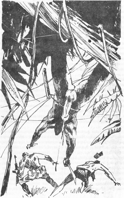 Я тщательно рассчитал скорость его перемещений между двумя точками и затем с места перепрыгнул через капот джипа как раз в тот момент, когда человек повернулся ко мне спиной. Он услышал шум и хотел было обернуться, но тут же рухнул с ножом в горле. Он умер, не успев крикнуть или нажать на спусковой курок своего оружия.