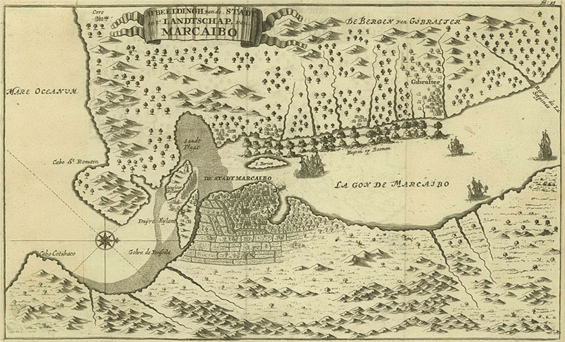 На острове Голубей есть укрепление (форт Сан-Карлос-де-ла-Барра. – В.Г.), которое отлично оберегает остров, ибо всякий, кто хочет попасть во внутреннее море, должен пройти впритык к этому форту. В устье пролива песчаная отмель или банка; глубина в ней не больше четырнадцати футов. Есть в этом месте и другие отмели… На западном берегу, примерно в шести милях от входа в бухту, расположен город Маракайбо (испанцы называли его Нуэва-Самора-дель-Лаго-де-Маракайбо. – В.Г.). Вид у него довольно приятный, потому что все дома выстроены вдоль берега и удачно расположены. Город густо заселен. Вместе с рабами в нем три или четыре тысячи жителей. Среди них восемьсот солдат – все испанцы. В городе есть церковь, четыре монастыря и госпиталь. Управляется город вице-губернатором, который подчинен губернатору Каракаса и входит в провинцию Каракас. Тамошние торговцы промышляют кожами и салом. У жителей много скота, а их плантации лежат милях в тридцати от Маракайбо, близ большого селения, которое называется Гибралтар [Сан-Антонио-де-Гибралтар]. Эти плантации дают много какао и различные овощи и плоды, которыми снабжают город Маракайбо… Каждый день из Гибралтара в Маракайбо отправляются барки, груженные лимонами, апельсинами, дынями и прочей снедью. В Маракайбо их нагружают мясом. В Гибралтаре нет ни коров, ни овец. Перед городом Маракайбо расположена прекрасная гавань, и там можно построить сколько хочешь кораблей…»